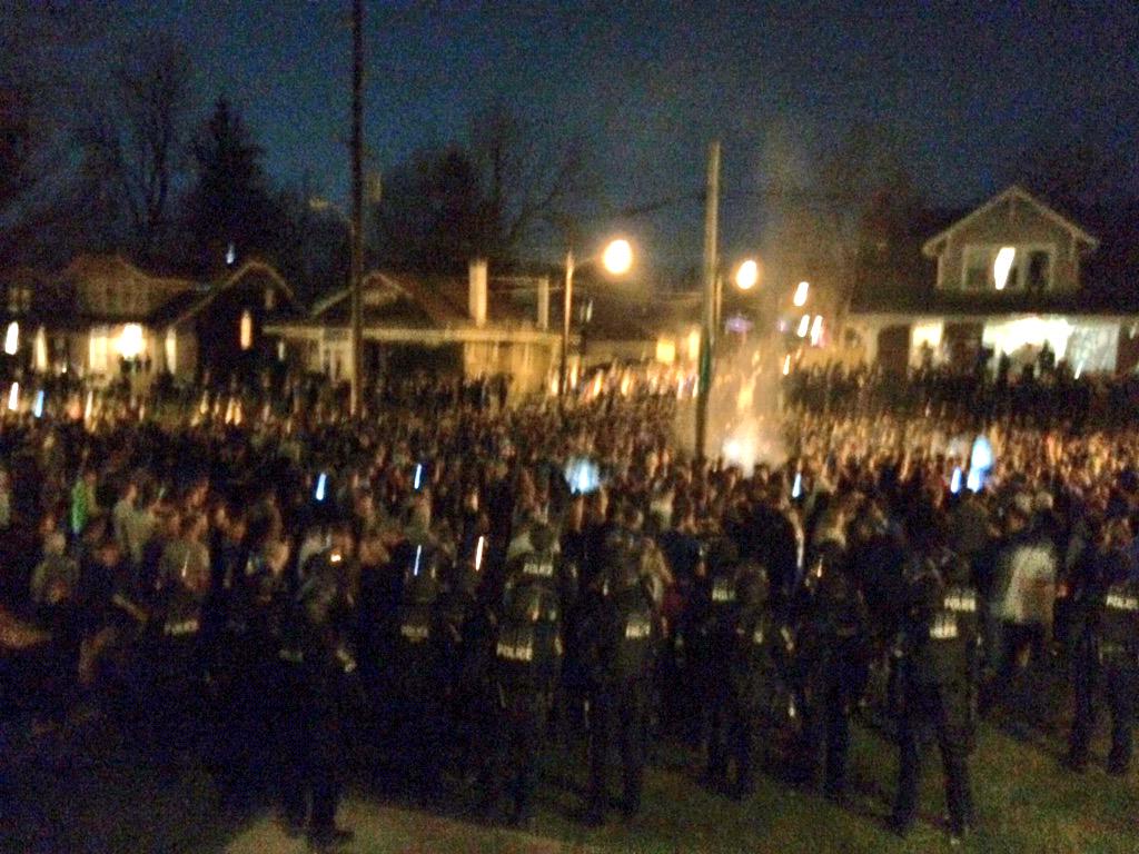 — LexingtonKYScanner (@LexKYScanner) April 5, 2015looking at the verbiage used in the text and the unfamiliar WWIII outfitted police and only 2 arrested and 27 detained have to police opted for policing without a vengeance or is it White kids will be White kids just upset at a second loss??? let's get real circumstance different, majority of the ethnicity different, reactions by students basically the same, police reaction benign and no one lying in the street blood flowing from head wounds, there is what appears to be a young women with blood on her face appears to be streaming down but wait the policeman appears to be comforting her looks like he cares about her well being. there is no video or pics of cops on tanks holding WMD's to audio so we don't know the tone, pictures posted show students burning stuff and cops surrounding while tear gas rises and maybe one empatheic officer friendly.